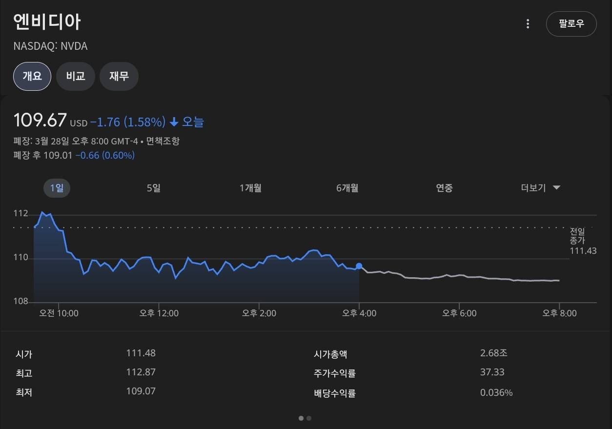 2025년 3월 29일 기준으로 NVIDIA의 주가는 109.67달러로 마감되었습니다!